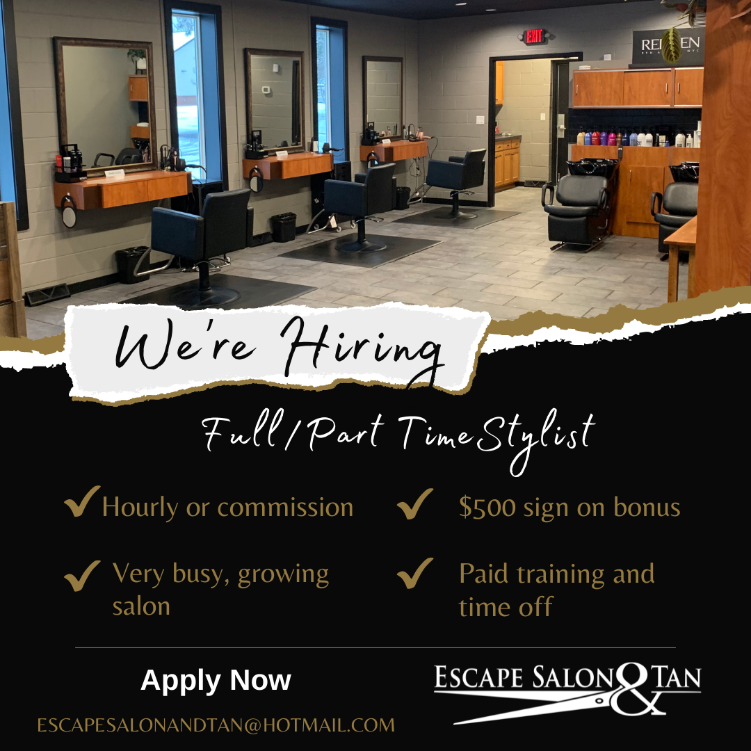 Drop off in person or email your resume to escapesalonandtan@hotmail.com